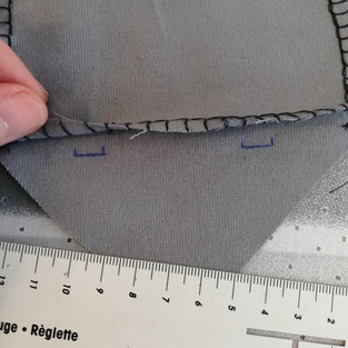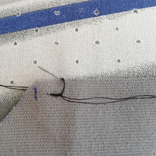 Hierzu stichst du von hinten in den Stoff ein und holst den Faden nach vorne(5). Steche jetzt ca 0,7 cm rechts wieder von hinten ein lass den Faden unter der Nadel liegen, das gibt nachher die Schlinge (6). Zieh den Faden durch, aber nicht zu fest, damit du die Kante nicht nach unten drückst (7). Jetzt stichst du wieder ca 0,7 cm rechts in den Stoff ein (8 + 9) und wiederholst den Vorgang, bis du an der ersten Ecke bist. Falls dein Faden zu Ende ist, dann stich ganz schmal vor der Ecke ein und dahinter wieder aus (10), mit der entstandenen Schlaufe kannst du einen Knoten machen und wieder neu ansetzen (11). Mach einen doppelten Knoten, damit nichts aufgeht.